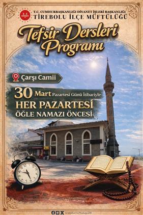 Bazen bir ayet, insanın içindeki sessizliği konuşturur… İlçe Müftülüğümüz olarak 30 Mart Pazartesi itibariyle Her pazartesi Çarşı Camii’nde Öğle namazı öncesi Tefsir derslerimiz başlıyor. Kalbine dokunan bir anlamın peşindeysen, yerin hazır.