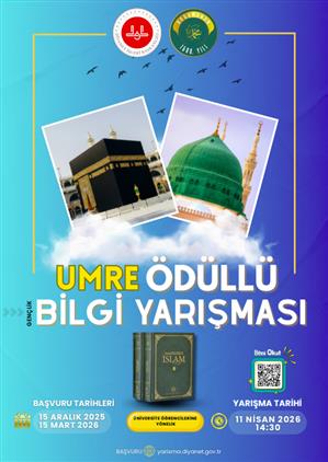 2026 Yılı Umre Ödüllü Gençlik Bilgi Yarışması, Mevlidi Nebi Haftası “Doğumunun 1500. Yılında Alemlere Rahmet Hz. Muhammed (s.a.s)” teması çerçevesinde gerçekleştirilecektir.