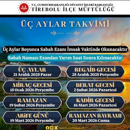 Üç aylar boyunca sabah ezanı imsak vaktinde okunacak, sabah namazı ise ezandan yarım saat sonra eda edilecektir.