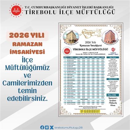 2026 yılı Ramazan İmsakiyelerimizi İlçe Müftülüğümüz ve Camilerimizden temin edebilirsiniz.
